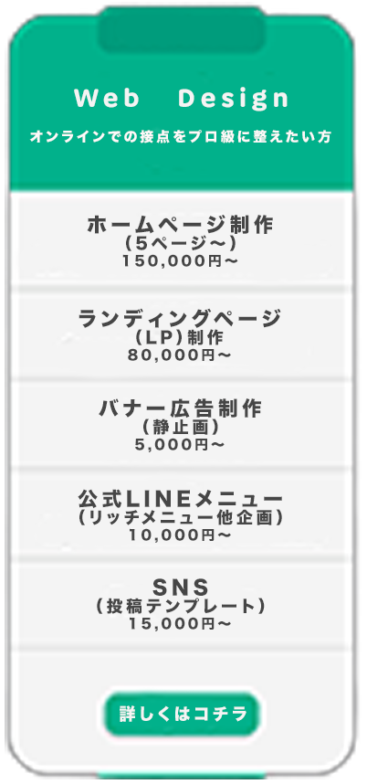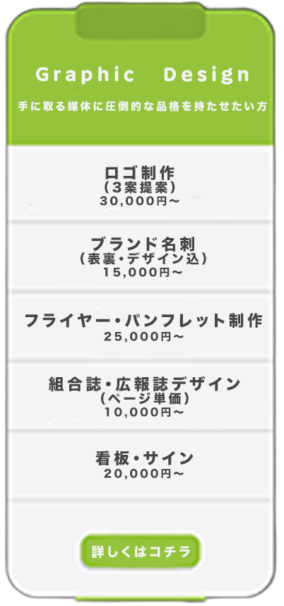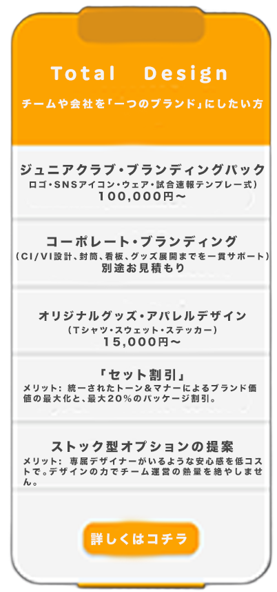 BRANDING PRICE LIST 「理想のスタイル」を、無理なく、かしこく。「高い・難しい」をなくした、明快なプライスリストです。 必要なものを、必要な分だけ選べる分割メニューで、 あなたの活動を、洗練された「ブランド」へと引き上げます。 「プロに頼むと高そう」 「何から始めればいいかわからない」 そんな不安に寄り添う、 分かりやすいステップ制の料金体系です。 ロゴひとつ、名刺一枚から、必要な分だけ選べる【分割メニュー】と、 日々のSNSや行事ですぐに使えるデータをセットにした【応援パック】をご用意しました。 無理なく、楽しみながら、あなたのチームを「一番のブランド」に育てていきませんか? ポイント1必要なものだけ、後から足せる 最初から全部作らなくても大丈夫。まずは「ロゴだけ」から始めて、後から「Tシャツ」や「HP」を追加できるから、予算に合わせて進められます。 ポイント2現場の「忙しい!」を助けるデータ付き デザインを作って終わりではなく、試合結果の報告やSNSで「そのまま使える」便利なデータがセット。忙しい監督や保護者の手間を減らします。 ポイント3相談しやすい「専属デザイナー」感覚 街の小さなデザインサロンだからこそ、LINE感覚で気軽に相談OK。チームの一員のような距離感でサポートします。 -Service Menu & Price- 目的に合わせた、3つのデザインカテゴリー 「お問い合わせはこちらから」デザインに関するご相談やご質問など、どんな小さなことでもお気軽にお問い合わせください。 お話しできることを楽しみにしています。 お問い合わせへ→
